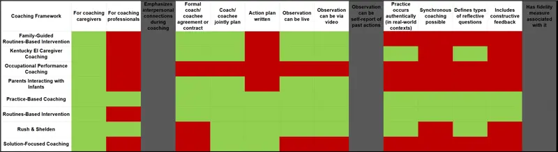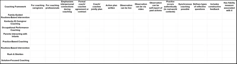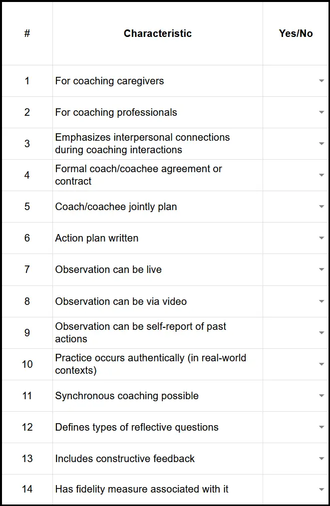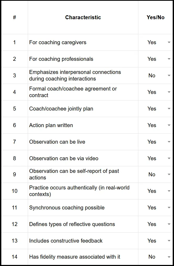 This is what a complete table looks like. Based on the characteristics selected as essential, only Practice-Based Coaching meets all characteristics.